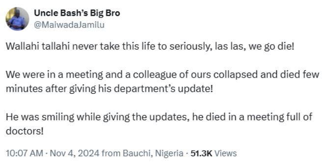 A Nigerian pharmacist, Maiwada Jamilu, has urged people not to take life too seriously while recounting an experience at work.