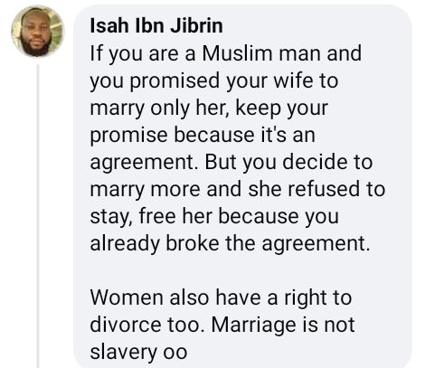 According to him, if the man decides to marry more than one wife despite his earlier promises, he should be willing to let his first wife go if she feels like it.