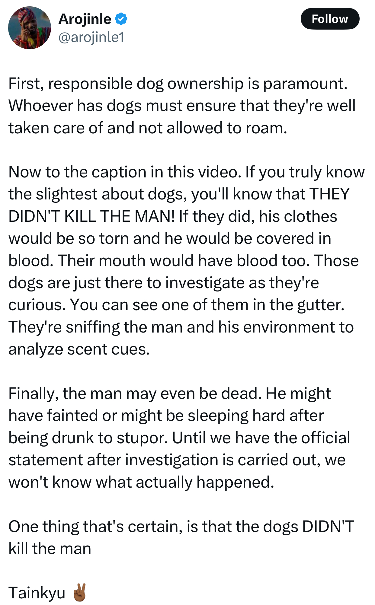 He disclosed this after some Nigerians began to doubt reports that the roaming dogs mauled the security guard to death on Monday, November 4.
