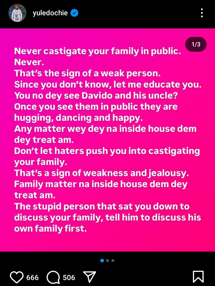 “Never castigate your family in public. Never. That’s the sign of a weak person. Since you don’t know let me educate you. You no dey see Davido and his uncle? Once you see them in public, they are hugging, dancing and happy. Any matter wey dey Na inside house dem they treat am.