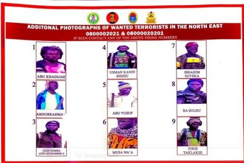 According to DHQ, the individuals declared wanted are: Abu Khadijah, Abur Rahman, Dadi Gumba, Abu Yusuf, Musa Wa’a, Usman Kanin Shehu, Ibrahim Suyeka, Ba Sulhu, and Idris Taklakse.