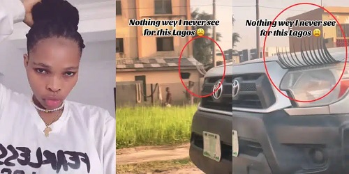 A Nigerian lady has expressed shock after spotting a car with eyelashes in Lagos.