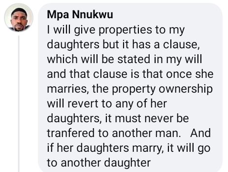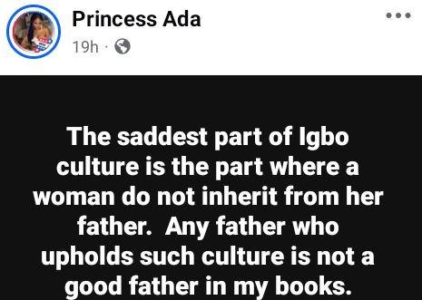 He stated this while reacting to a Facebook post by one Princess Ada, who lamented over female disinheritance culture among the Igbos.