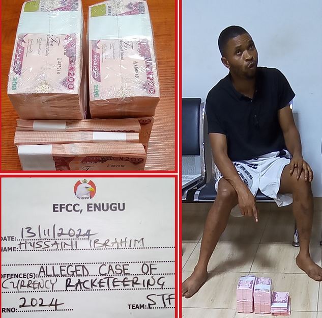 A man identified as Hussaini Ibrahim has been arrested by the Enugu Zonal Directorate of the Economic and Financial Crimes Commission, EFCC for alleged currency racketeering of N460, 000. 00 (Four Hundred and Sixty Thousand Naira).