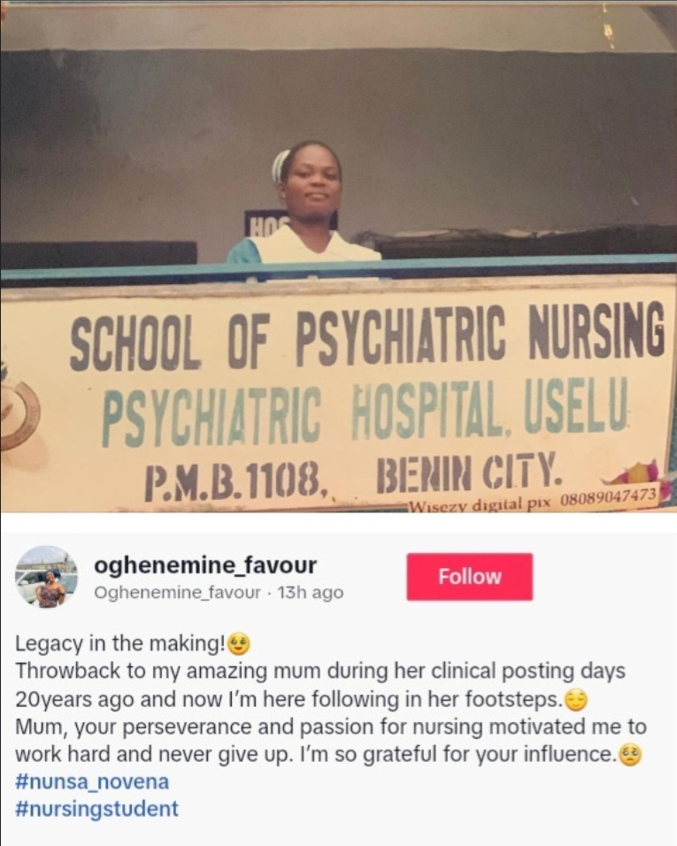 In the caption, the nurse, whose name is Favour Oghenemine, wrote: "Legacy in the making. Throwback to my amazing mum during her clinical posting days 20 years ago and now I'm here following in her footsteps."