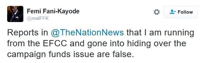Former Minister of Aviation, Femi Fani-Kayode, has denied media reports that he is in hiding from the Economic and Financial Crimes Commission, EFCC.