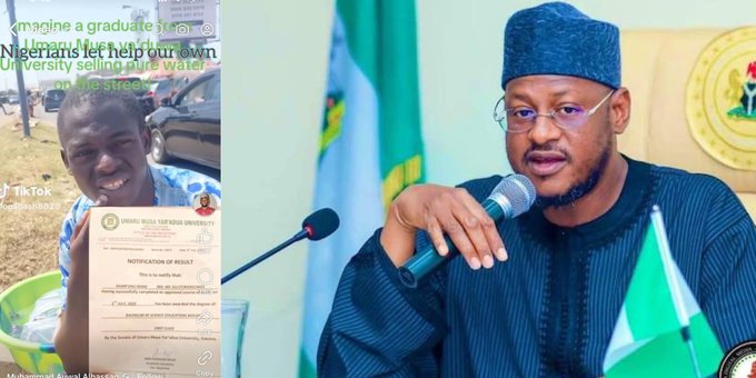 Sham’unu Ishaq, a first-class graduate of Umaru Musa Yar’adua University, has been offered immediate employment by Governor Dikko Umar Radda of the state after a video of him selling sachet water to support his family went viral.