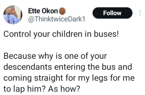 “Control your children in buses. Because why is one of your descendants entering the bus and coming straight for my legs for me to lap him? As how?” he wrote.