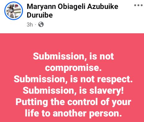 A Nigerian woman, Maryann Obiageli Duruibe, has given her opinion on marriage and submission.