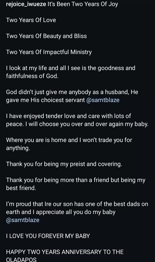 Her post reads,”It’s Been Two Years Of Joy.To Years Of Love, Two Years Of Beauty and Bliss.Two Years Of Impactful Ministry”.