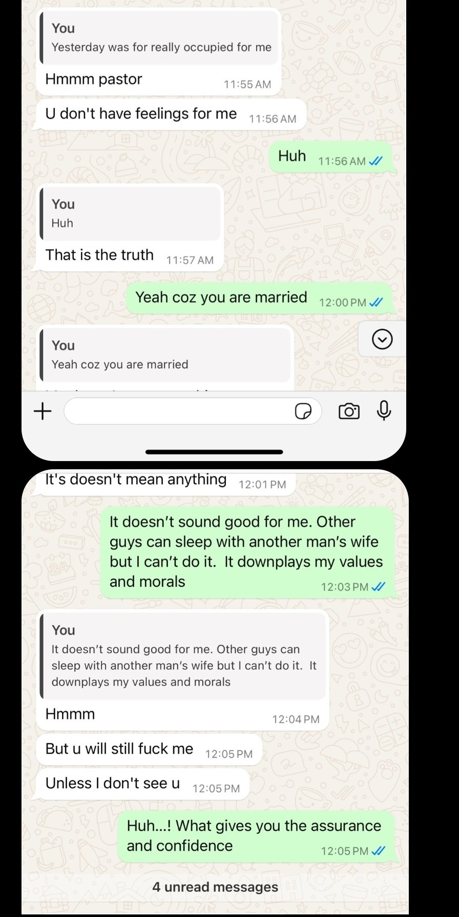 But lately, she reached out to him and has been disturbing him for s3x even though she's married.