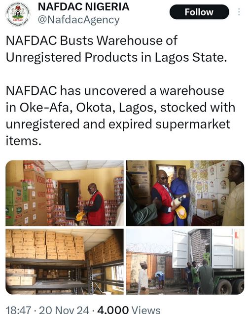 The National Agency for Food and Drug Administration and Control (NAFDAC) conducted a raid on a warehouse in Oke-Afa, Okota, Lagos, filled with unregistered and expired goods.