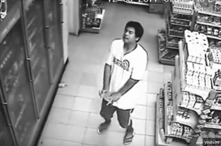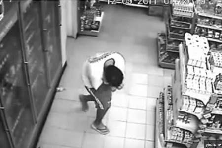 At the beginning of the clip he resembles any other shopper, reaching into a fridge and taking out a cold drink.