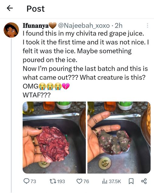 A lady has been left horrified after she found something weird inside the pack of red grape juice she was consuming.
