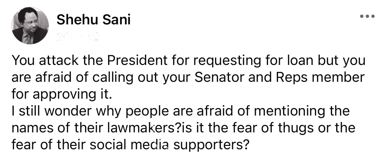 In a post shared on his Facebook handle, Sani wrote; ‘’You attack the President for requesting for loan but you are afraid of calling out your Senator and Reps member for approving it.