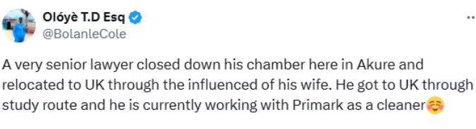 “A very senior lawyer closed down his chamber here in Akure and relocated to the UK through the influence of his wife. He got to UK through study route and he is currently working with Primark as a cleaner."