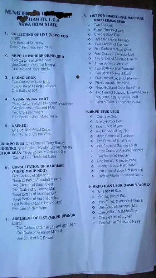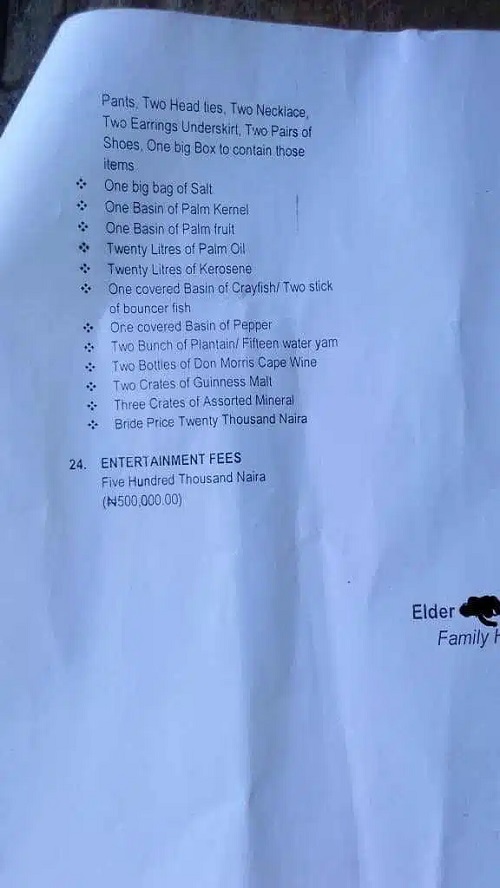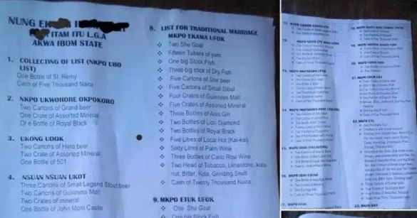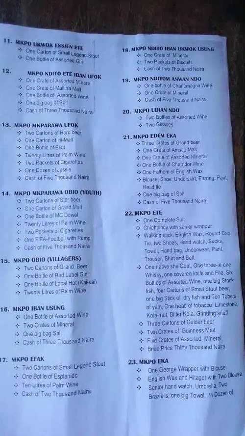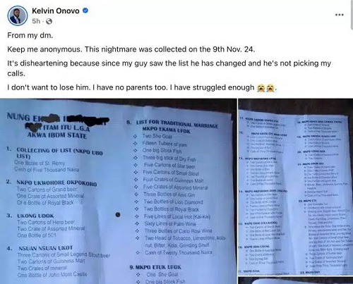 A lady sent the outrageous bride price list to influencer Kelvin Onovo who shared it online.