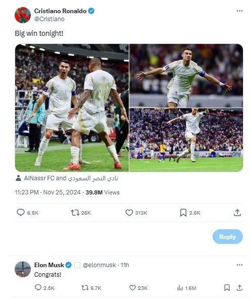 Football icon, Cristiano Ronaldo has been congratulated by Tesla and social media platform, X owner, Elon Musk.