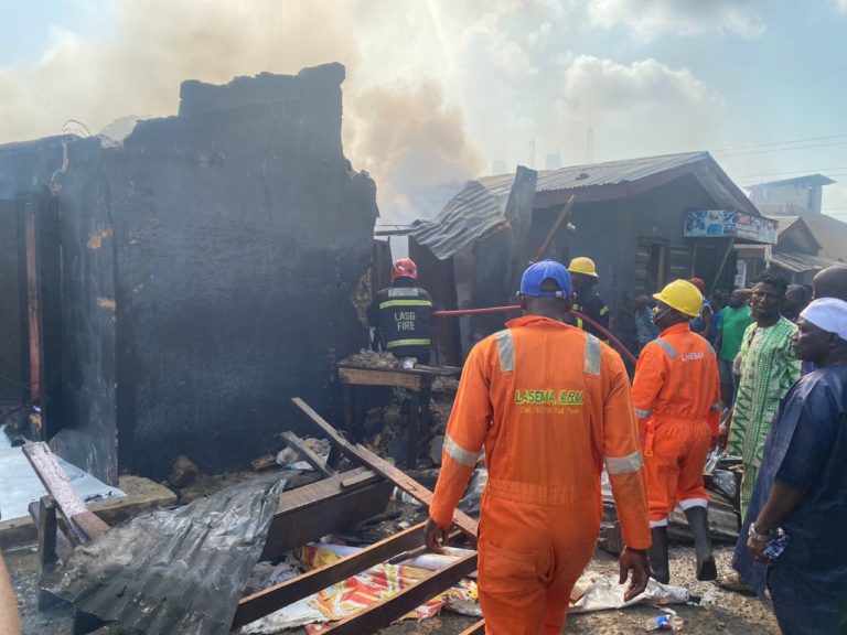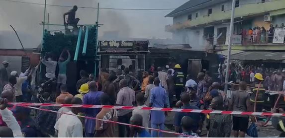 A massive fire tore through Alayabiagba Market at Boundary, Ajegunle, Lagos, destroying at least 11 shops and causing losses valued at millions of naira.