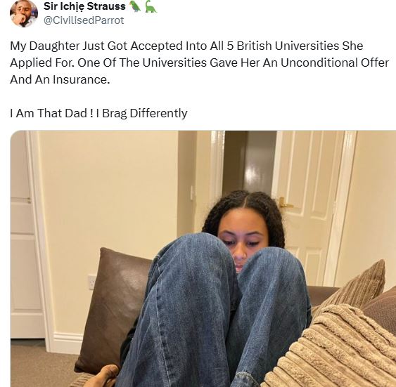 “My Daughter Just Got Accepted Into All 5 British Universities She Applied For. One Of The Universities Gave Her An Unconditional Offer And An Insurance. I Am That Dad ! I Brag Differently,” he wrote.