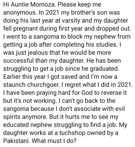 "Earlier this year I got saved and I’m now a staunch churchgoer. I regret what I did in 2021. I have been praying hard for God to reverse it but it’s not working. I can’t go back to the sangoma because I don’t associate with evil spirits anymore.
