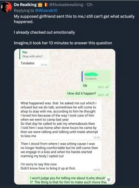 A man identified on X (formerly Twitter) as @Ebukaderealking has shared an emotional confession from his girlfriend, leaving many users debating the complexities of relationships and trust.