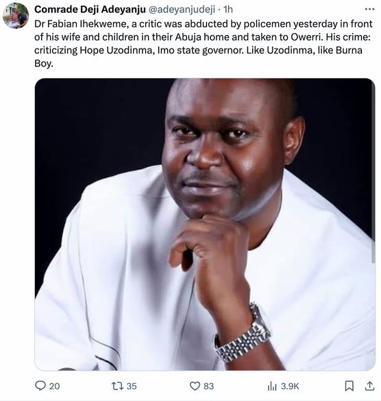 He wrote, “Dr Fabian Ihekweme, a critic, was abducted by policemen yesterday in front of his wife and children in their Abuja home and taken to Owerri.