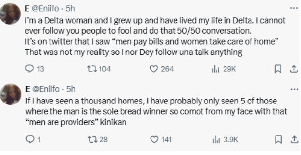 She wrote: “I’m a Delta woman and I grew up and have lived my life in Delta. I cannot ever follow you people to fool and do that 50/50 conversation. It’s on twitter that I saw “men pay bills and women take care of home” That was not my reality so I nor Dey follow una talk anything.”