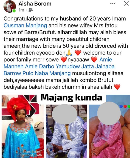 A Gambian woman, Aisha Borom has congratulated her husband of 20 years after he took a second wife.