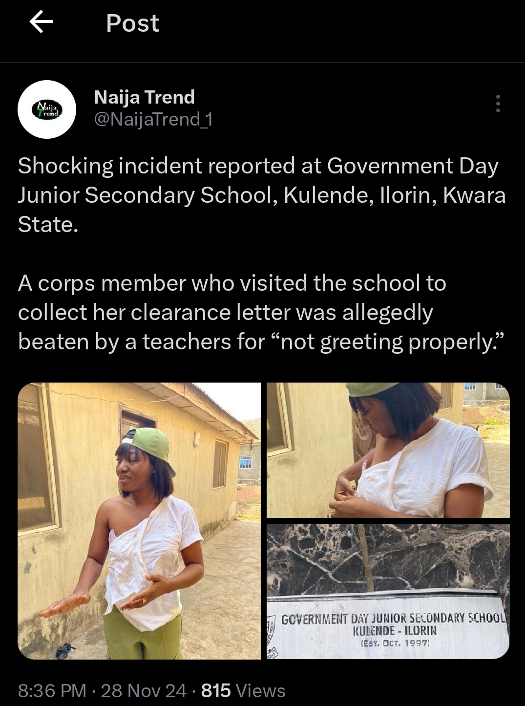 A youth corps member has been reduced to tears after a teacher assaulted her for “not greeting properly.”