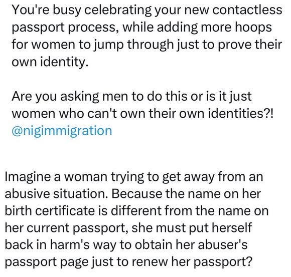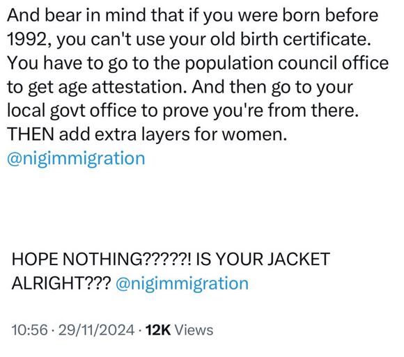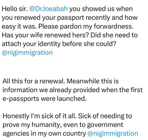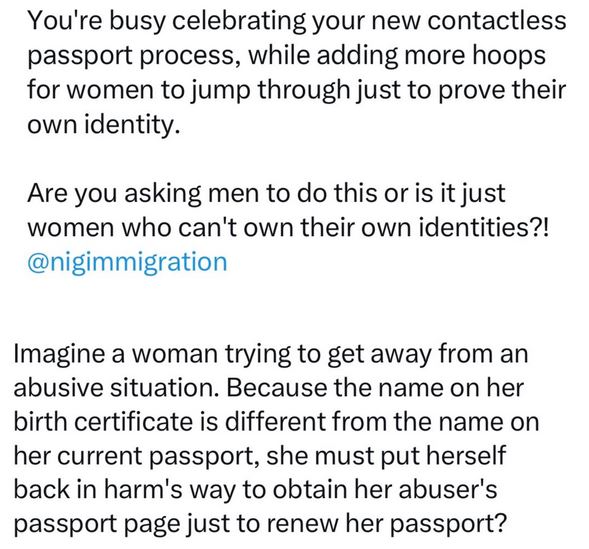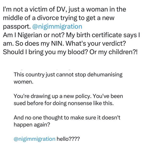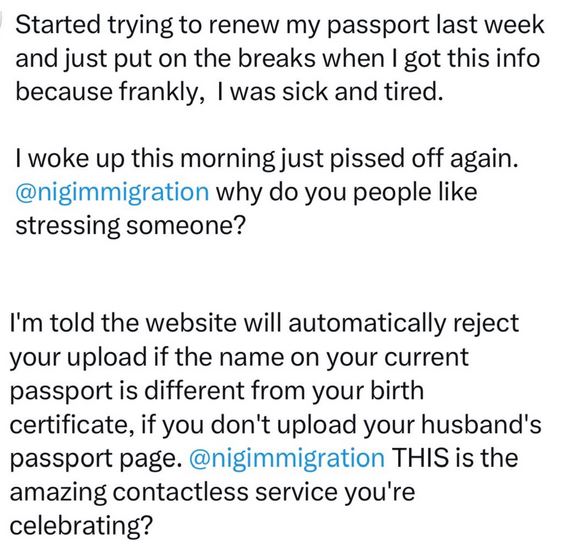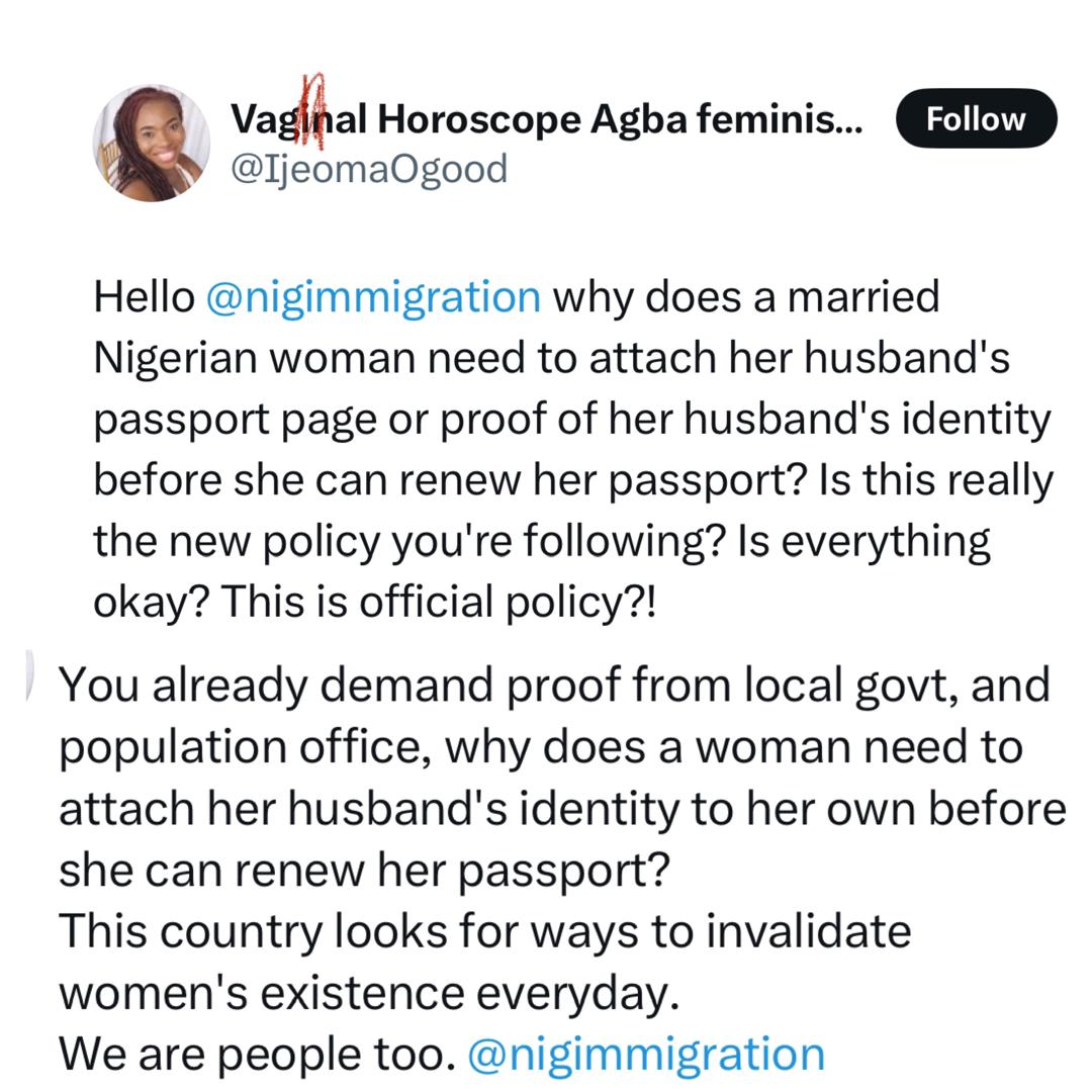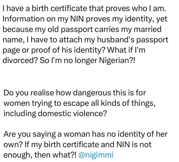 A Nigerian writer has raised concerns on social media, questioning the Nigerian Immigration Service about why a married woman is required to provide her husband's passport page or proof of his identity to renew her passport.