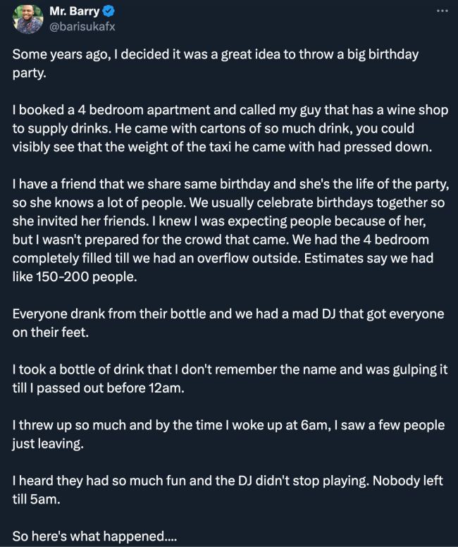 In the viral post, the man identified as @barisukafx on X (formerly Twitter) narrated how he went all out for the celebration, booking a four-bedroom apartment and ordering a massive supply of drinks from a friend who owns a wine shop.