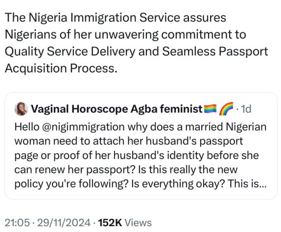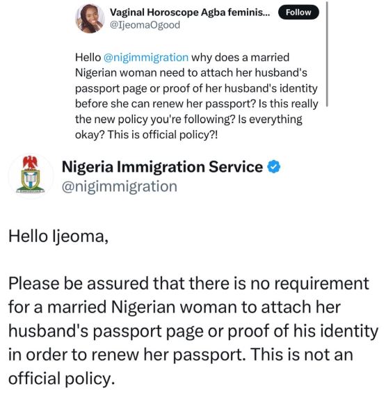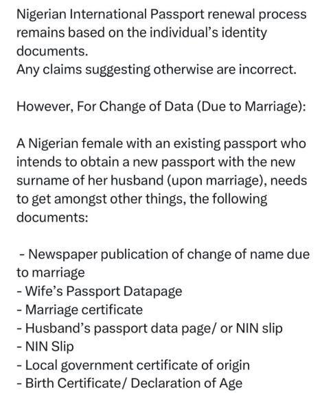 Reacting via its X handle, the NIS said there is no such law that says married women must attach their husbands' passport pages or proof of their husbands' identity before they can renew their passports.