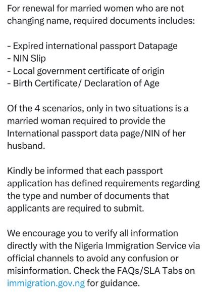 The Nigeria Immigration Service (NIS) has denied claims that it requires married women to submit their husbands' passport data pages or proof of their husband's identity in order to renew their own passports.