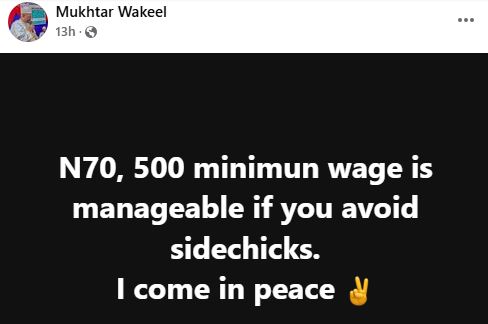 “N70, 500 minimum wage is manageable if you avoid side chicks. I come in peace,” he wrote.