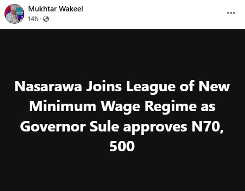 He stated this on Saturday after the Nasarawa State Government reportedly approved N70,500 as new minimum wage for state workers.