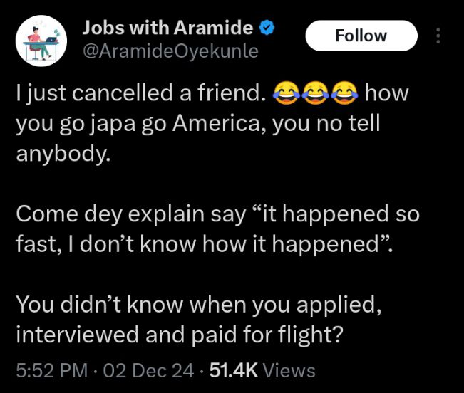 He wrote, “I just cancelled a friend. How you go japa go America, you no tell anybody.