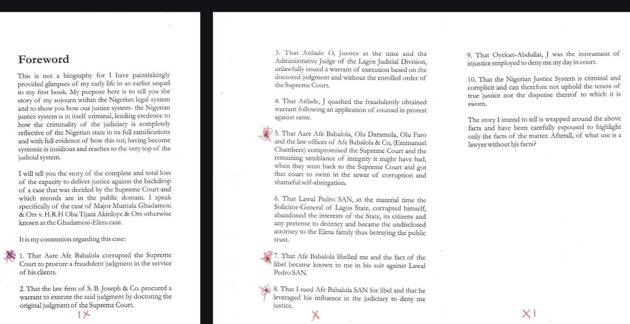 He was alleged to have defamed Afe Babalola in his book "Nigeria and its criminal justice system."
