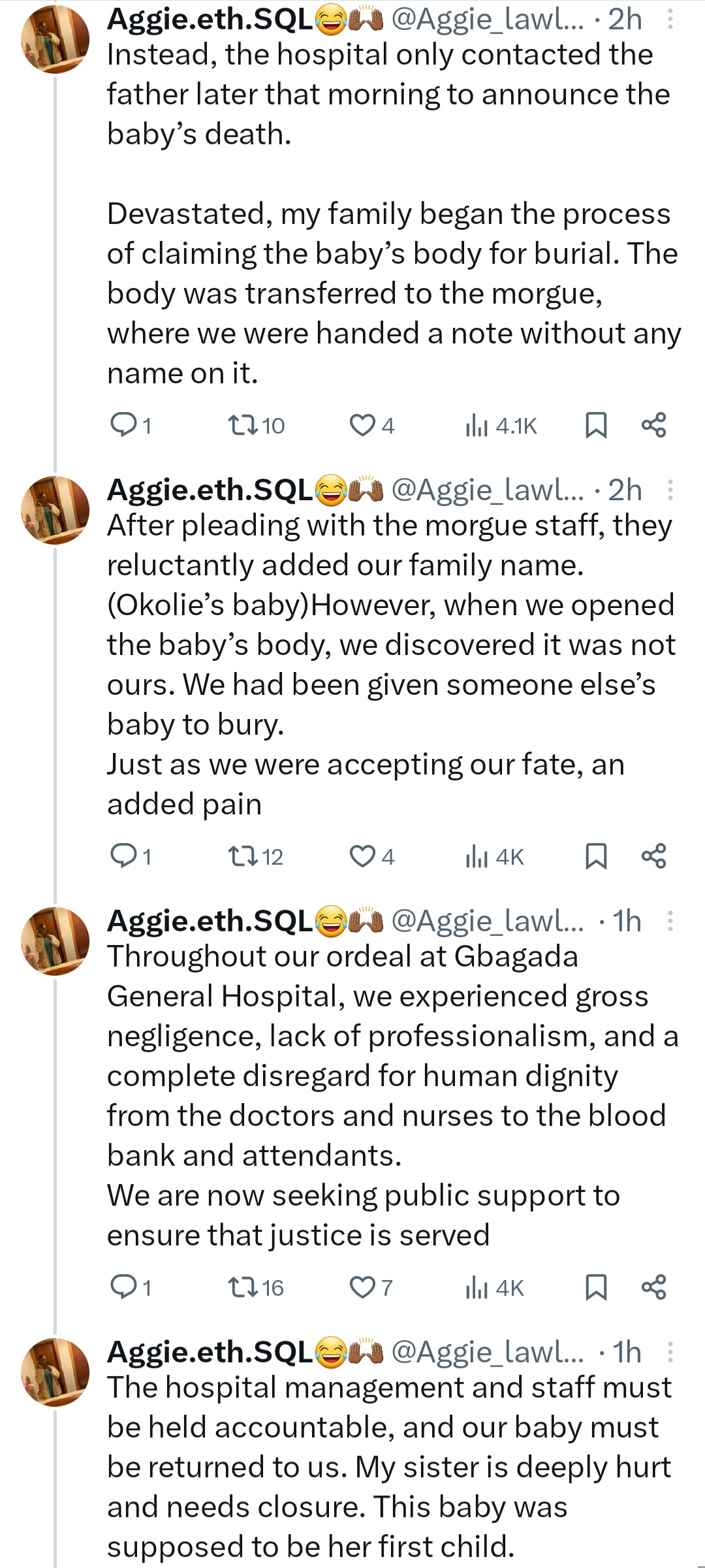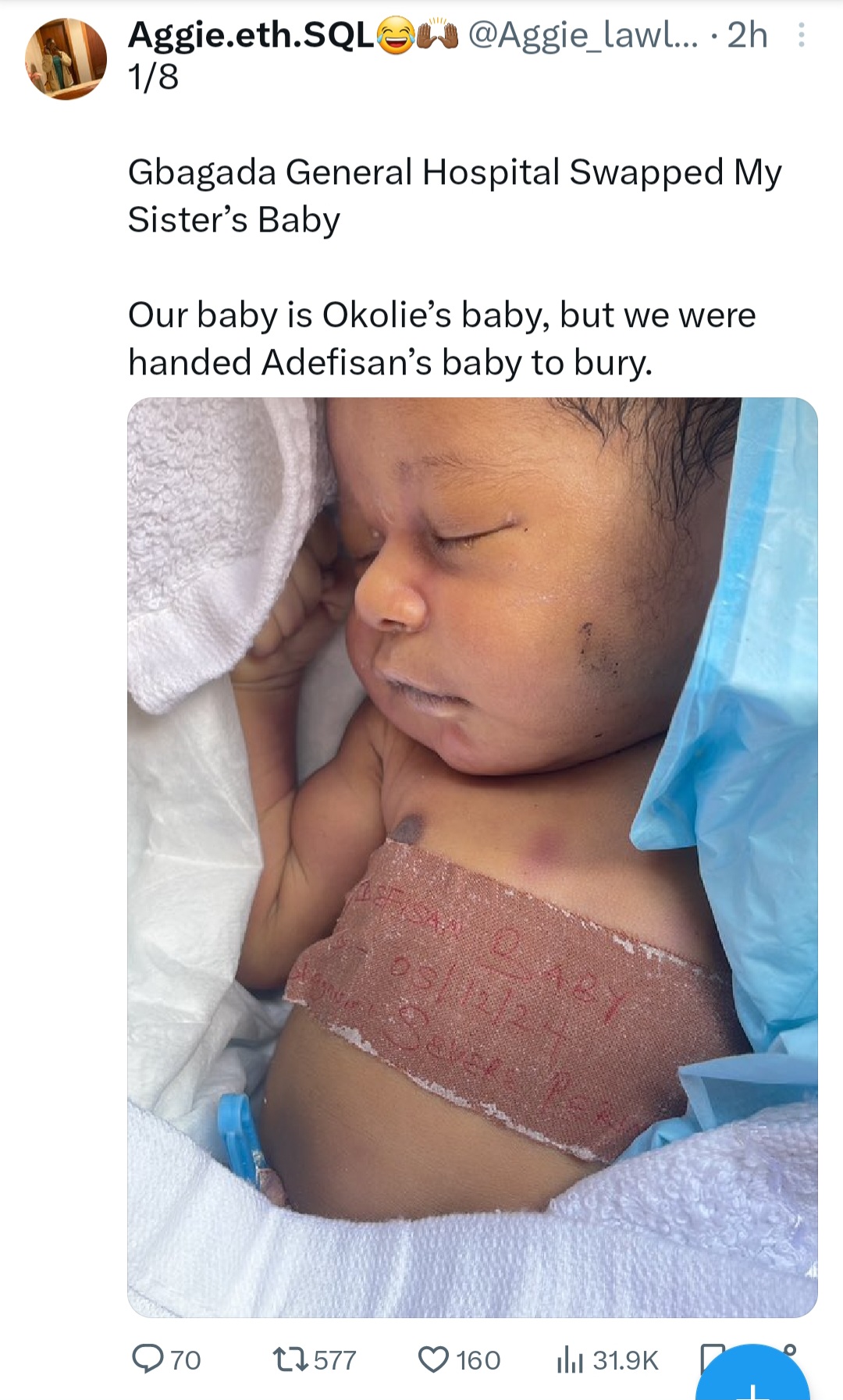 A Nigerian woman on the social media platform, X has alleged that Gbagada General Hospital swapped her sister's newborn baby with another person's deceased infant.