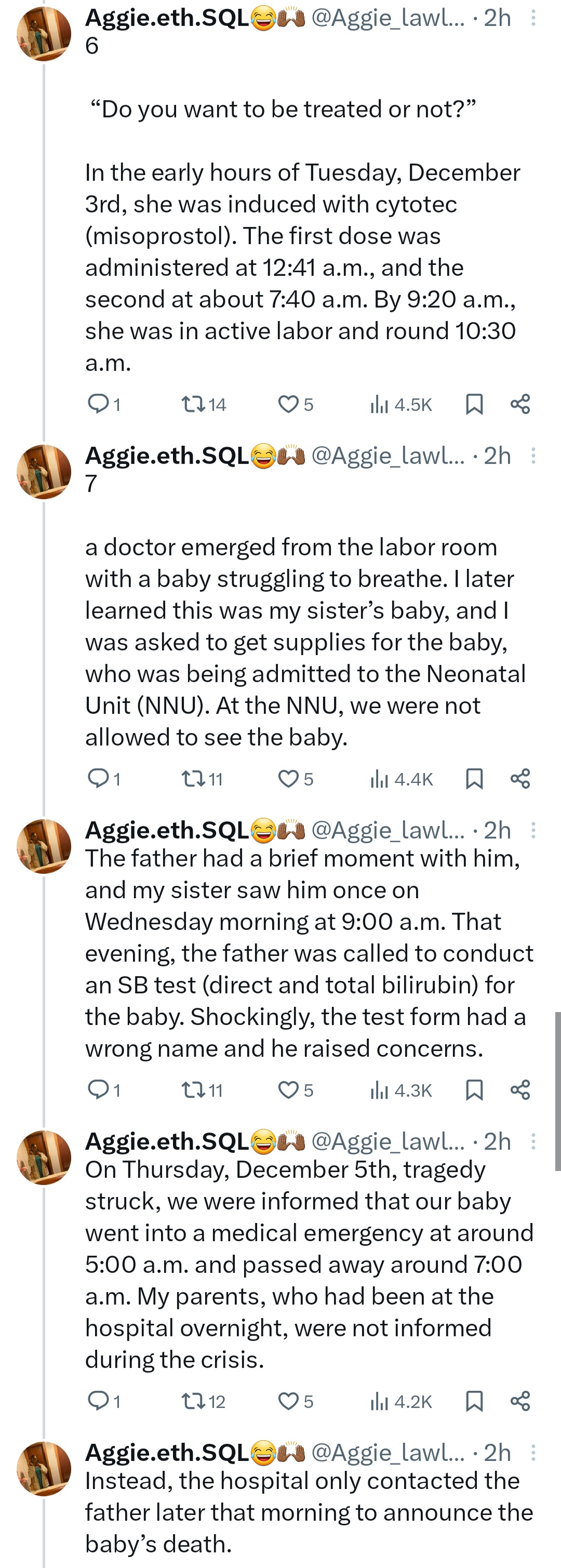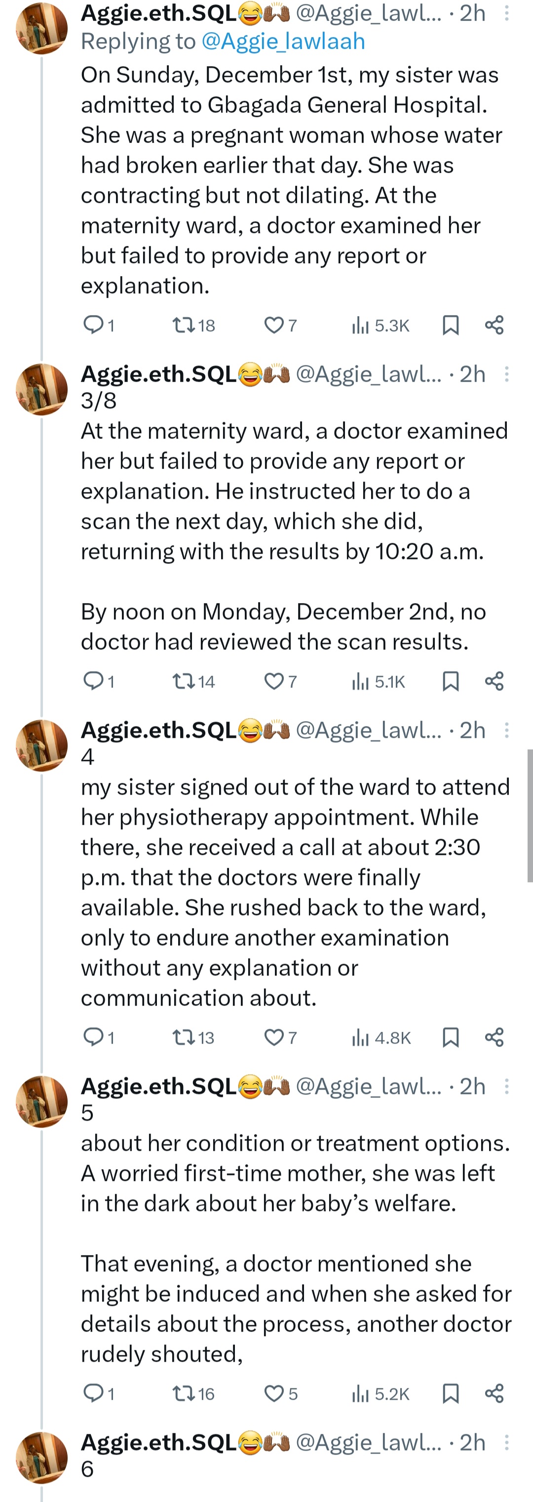 The X user with the handle @Aggie_lawlaah narrated how her sister started contracting on Dec. 1 and was induced two days later when she gave birth.
