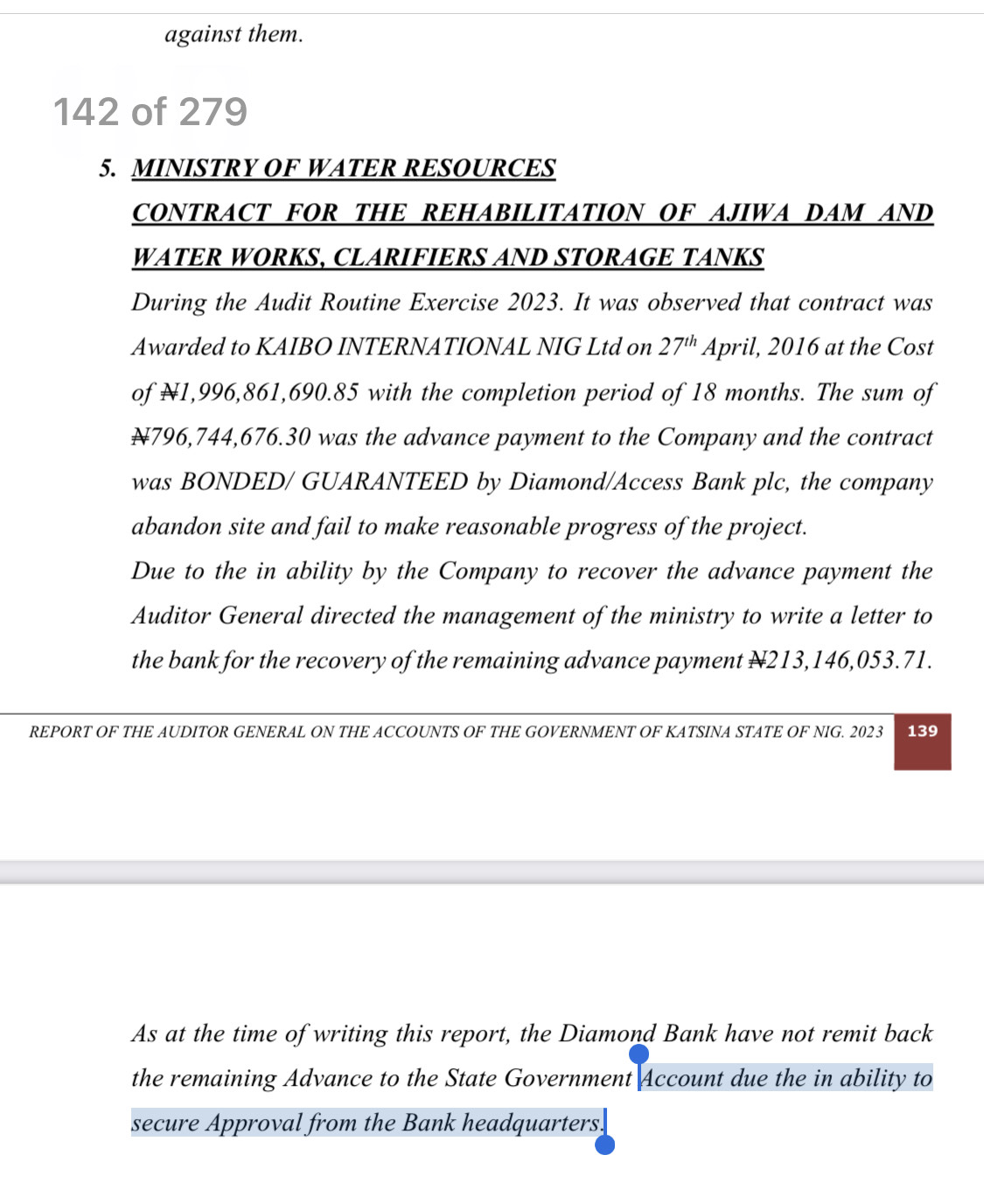 “As at the time of writing this report, the Diamond Bank has not remitted back the remaining Advance to the State Government account due the in ability to secure Approval from the Bank headquarters.” the report read.