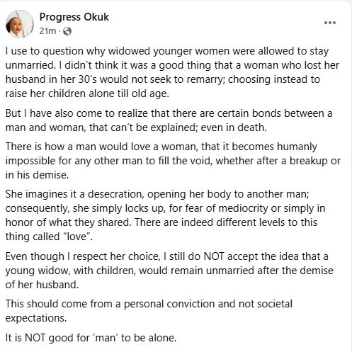 “I use to question why widowed younger women were allowed to stay unmarried. I didn’t think it was a good thing that a woman who lost her husband in her 30’s would not seek to remarry; choosing instead to raise her children alone till old age,” she wrote in a Facebook post on Friday.