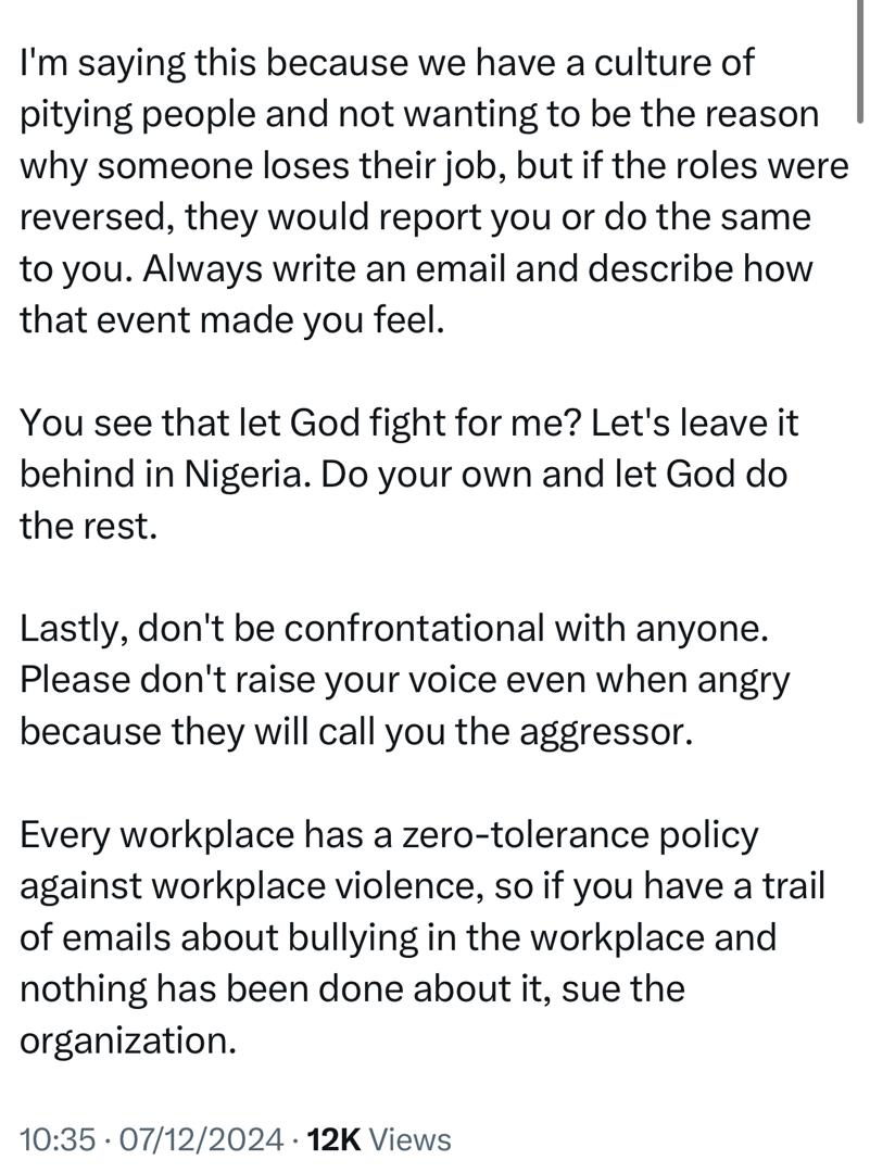 A Nigerian nurse living overseas has urged Nigerians working abroad to report any instances of uncivil behavior encountered in their workplaces.