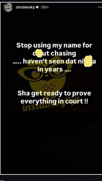 Reacting in the deleted post, Zino wrote: “Stop using my name for clout chasing Haven’t seen that nigga in years.Sha get ready to prove everything in court “.
