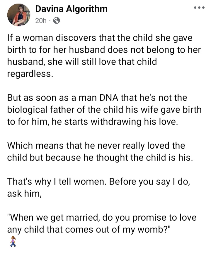 A Nigerian lady, Davina Algorithm has left tongues wagging on social media after slamming men who abandon their kids after DNA result shows they’re not their biological children.
