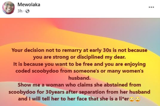 “Your decision not to remarry at early 30s is not because you are strong or disciplined my dear. It is because you want to be free and you are enjoying coded scoobydoo from someone's or many women's husband. Show me a woman who claims she abstained from scoobydoo for 30years after separation from her husband and I will tell her to her face that she is a li*er,” she wrote.