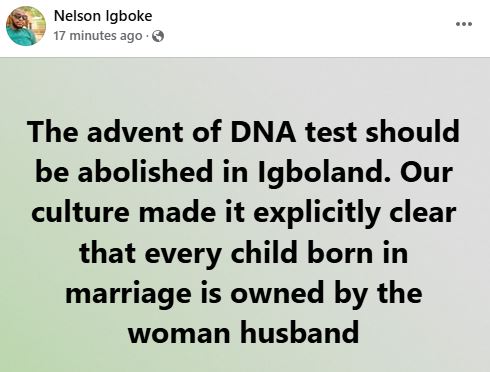 "The advent of DNA test should be abolished in Igboland. Our culture made it explicitly clear that every child born in marriage is owned by the woman husband," he wrote.