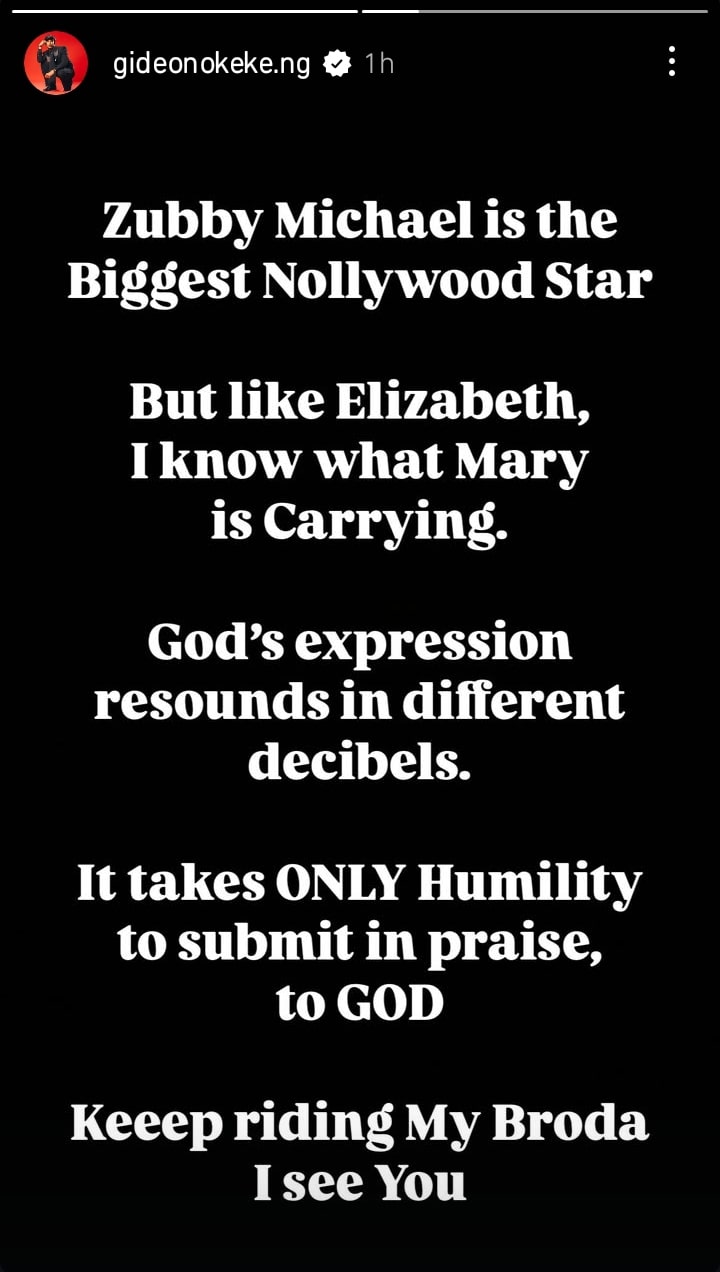 Taking to his Instagram story, he crowned Zubby the biggest Nollywood star as he compared himself to Elizabeth who knew what Mary was carrying.