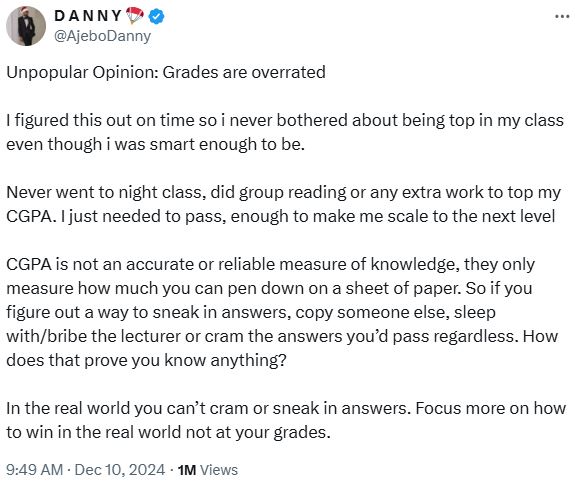 In a post shared on X, the Nigerian man wrote; ‘’Unpopular Opinion: Grades are overrated