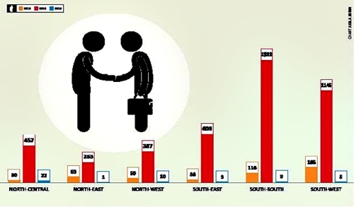 South-south got 1,647 (33.6 per cent); South-west 1,336 (27.2 percent); South-east 642 (13.1 percent); North-central 509 (10.4 percent); North-west 447 (9.1 percent) and North-east 323 (6.6 percent).